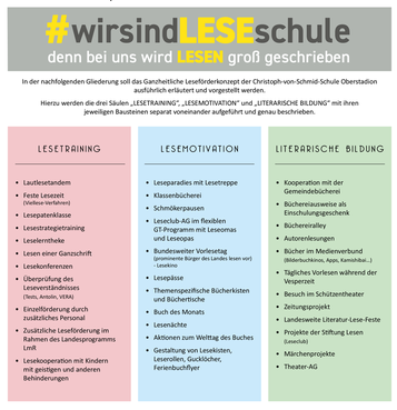 Hierzu werden die drei Säulen „LESETRAINING“, „LESEMOTIVATION“ und „LITERARISCHE BILDUNG“ mit ihren jeweiligen Bausteinen separat voneinander aufgeführt und genau beschrieben.